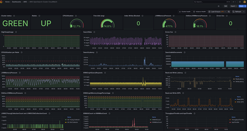 - CloudWatch metrics from OpenSearchService itself — data on CPU, memory, and JVM, which we can collect in VictoriaMetrics and generate alerts or use in the Grafana dashboard, see Monitoring OpenSearch cluster metrics with Amazon CloudWatch