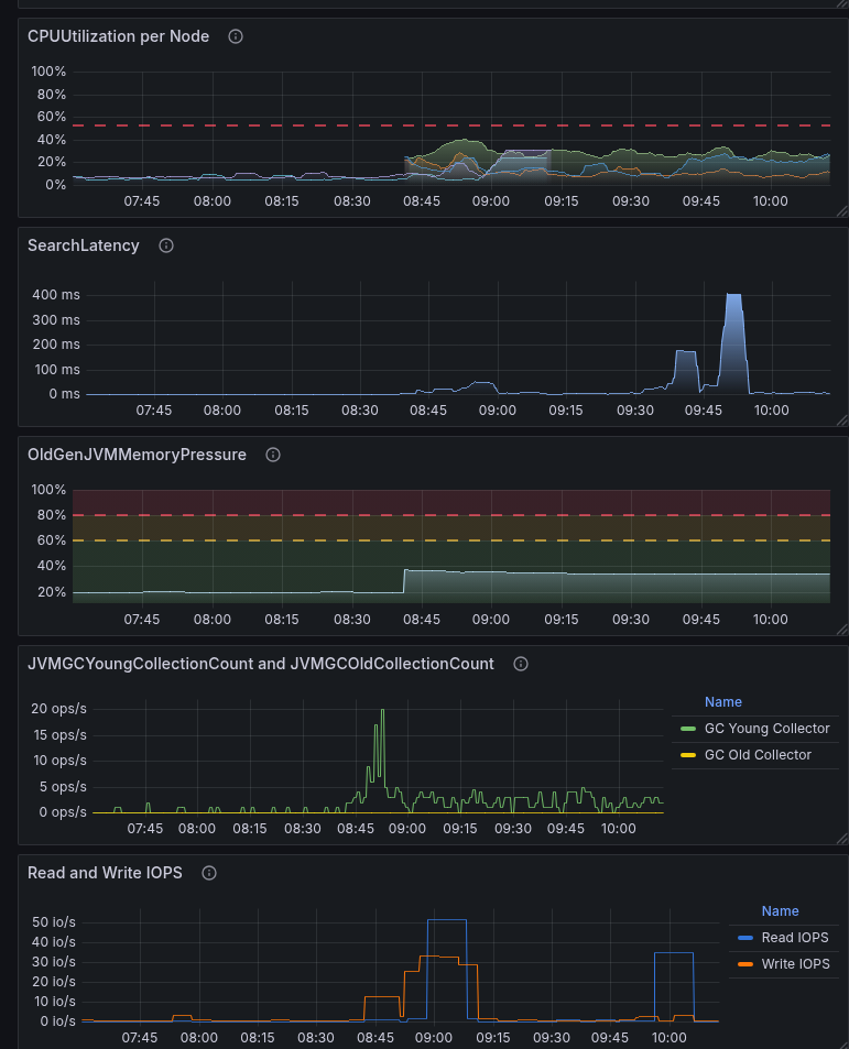 And here’s an example of how a lack of resources, primarily memory, is reflected in the graphs: we had t3.medium.search, then we switched back to t3.small.search to see how it would affect performance.