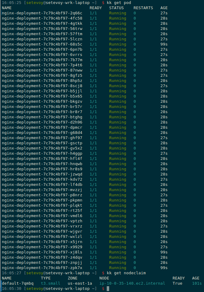 Deploy it, and Karpenter creates a single NodeClaim with a t3.small instance: