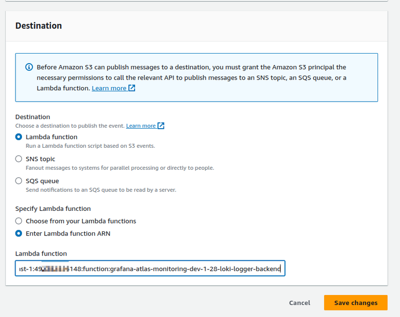 - an IAM Role ARN — a role that is connected to our Lambda function with Promtail