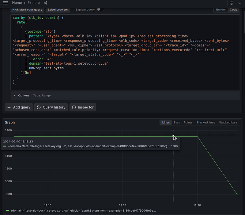 Here, we take the value of the sent_bytes field from unwrap sent_bytes, pass it to sum_over_time[1s], and get our 1706 bytes per second: