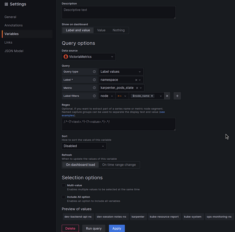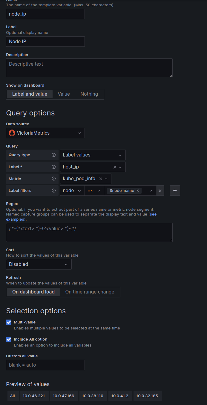So to apply node_cpu_seconds_total with our variable $node_name we can add a new variable node_ip, which will be formed from the metric kube_pod_info with a filter by the label node, where we use our old variable node_name - to select Pods only from the Nodes selected in the filters.