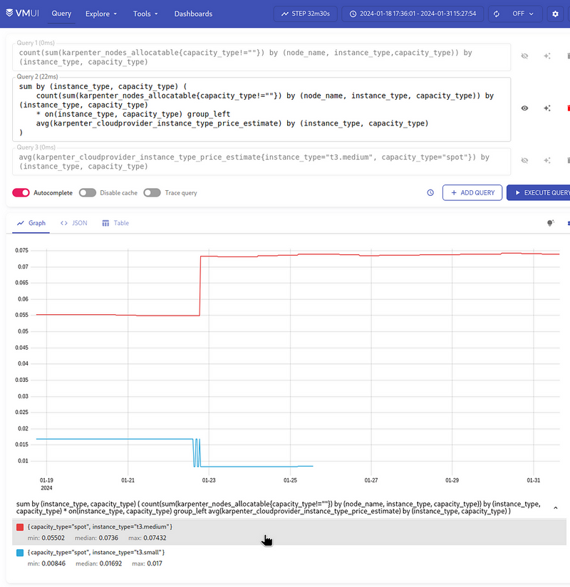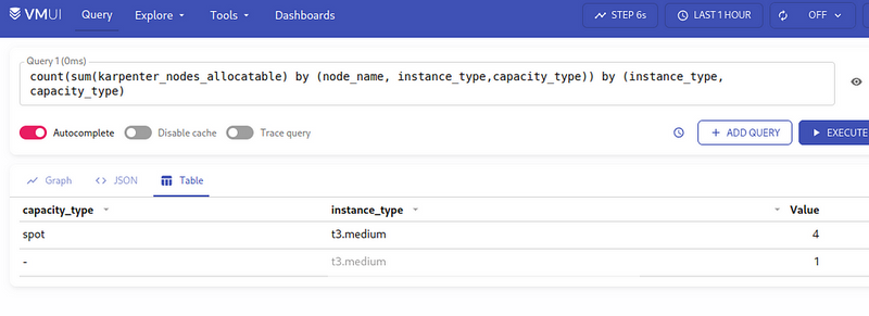 count(...) by (instance_type, capacity_type): the result of the previous query is counted with count to get the number of each combination - we get the number of WorkerNodes of eachinstance_typeandcapacity_type - second query —