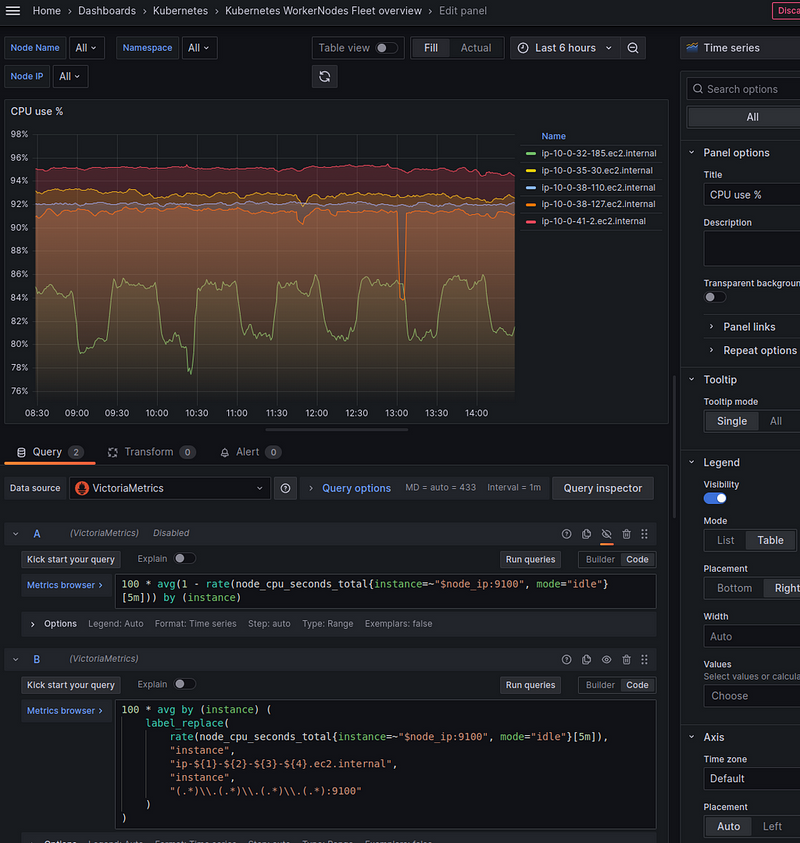Here, we will use the default metrics from Node Exporter — node_cpu_seconds_total, but they have instance labels in the form instance="10.0.32.185:9100", and not node_name or node as in Karpenter metrics (karpenter_pods_state{node="ip-10-0-46-221.ec2.internal"}).