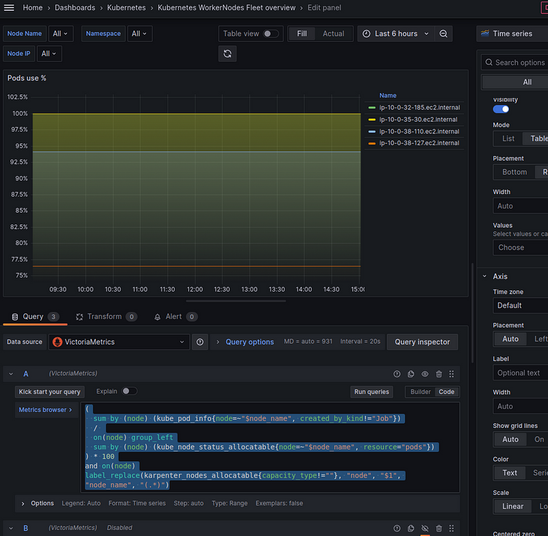 Or we can exclude our default Node “ip-10–0–41–2.ec2.internal” and display only the Nodes of Karpenter itself by adding a selection by karpenter_nodes_allocatable{capacity_type!=""} - because we are more interested in how busy the Nodes created by Karpenter itself for our applications.