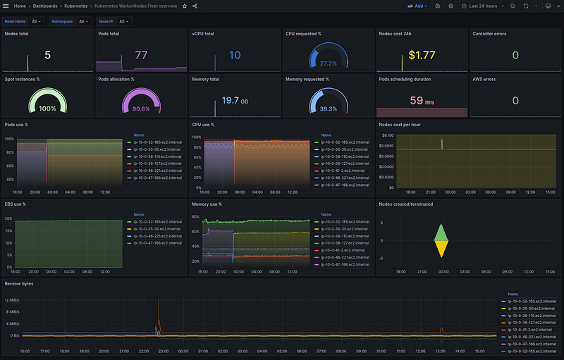 karpenter_nodes_allocatable: information on existing WorkerNodes - types, amount of CPU/Memory, Spot/On-Demand, Availability Zone, etc. - you can have a graph by the number of Spot/On-Demand instances