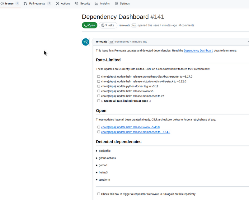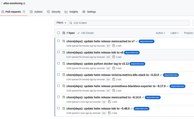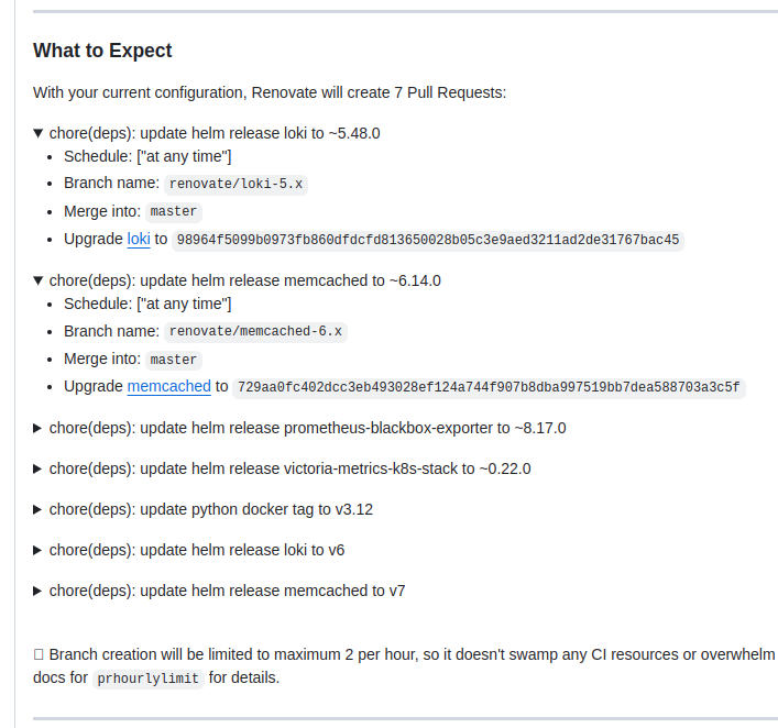 Although I mentioned “Helm Charts” in the title of this post, out of the box and with the default settings, Renovate will check just about anything in the repository that has any versions and dependencies.