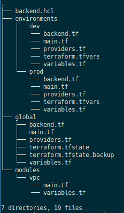 Then we can deploy separate environments either by executing cd environments/dev && terraform apply or terraform apply -chdir=environments/dev. The backend configuration can be passed via terraform init -backend-config=backend.hcl.