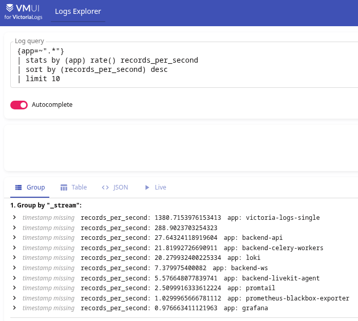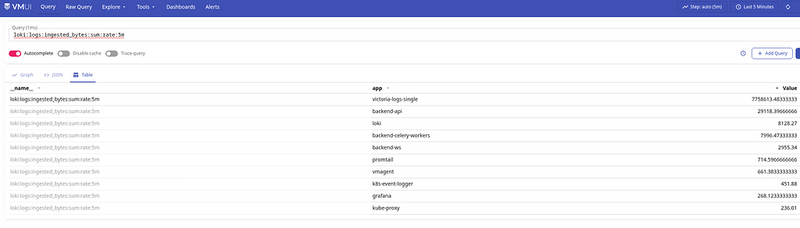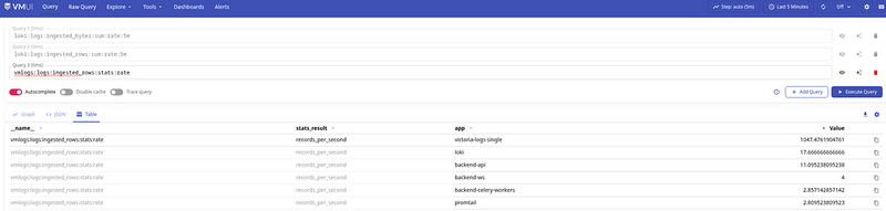 Here, too, everything is simple: either we use the default metrics from Loki and VictoriaLogs, or we generate our own.