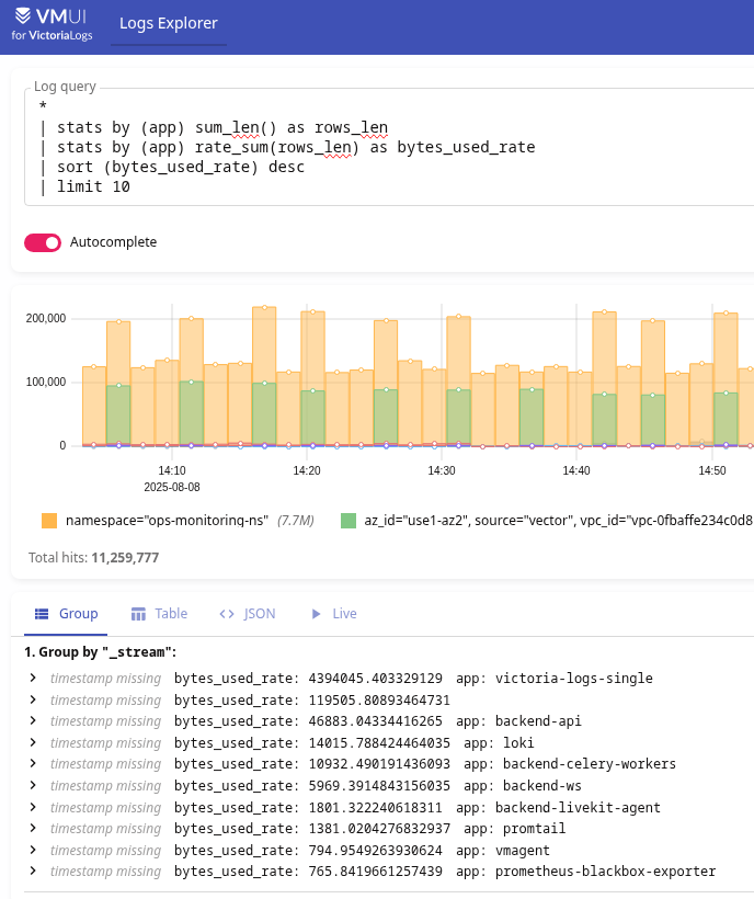 In addition, the VictoriaLogs graph shows that most logs come from the Namespace ops-monitoring-ns, where VictoriaLogs lives: