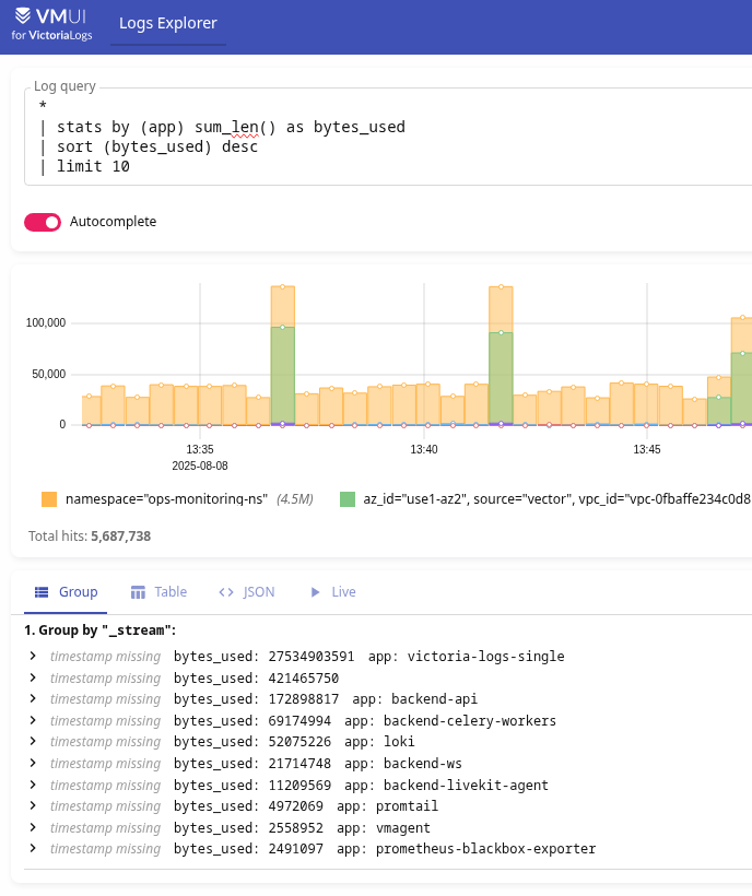 - the disk on VictoriaLogs was getting clogged up — we had to reduce retention and increase the disk size, even though it had been sufficient before
