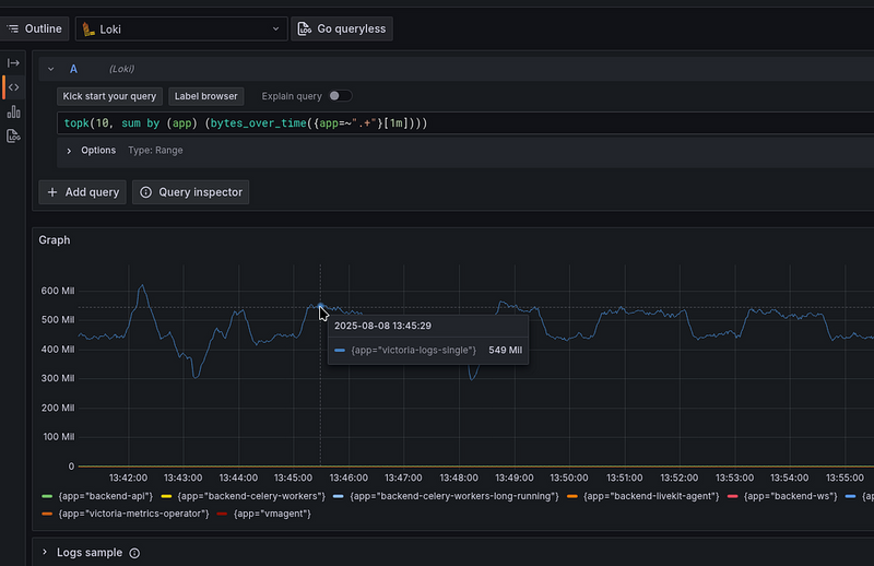 I started digging with the “ Ingestion rate limit exceeded ” error in Loki, because the disk space on VictoriaLogs was full for the same reason — too many logs were being written.