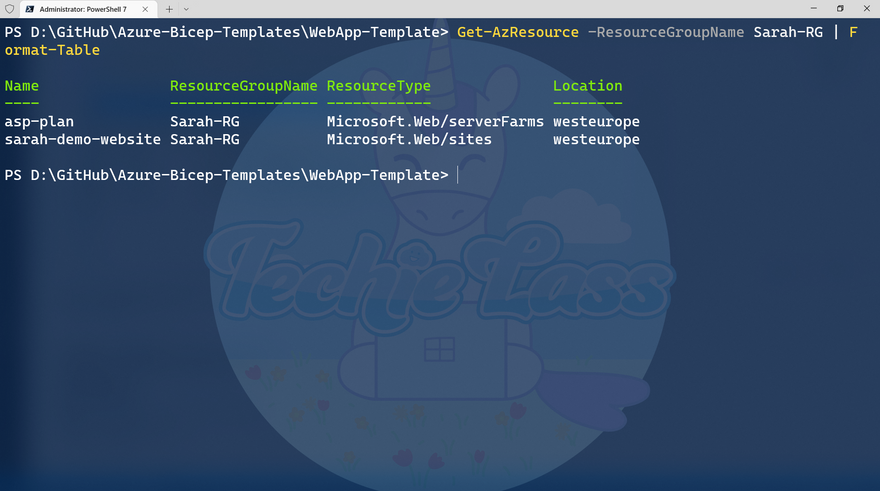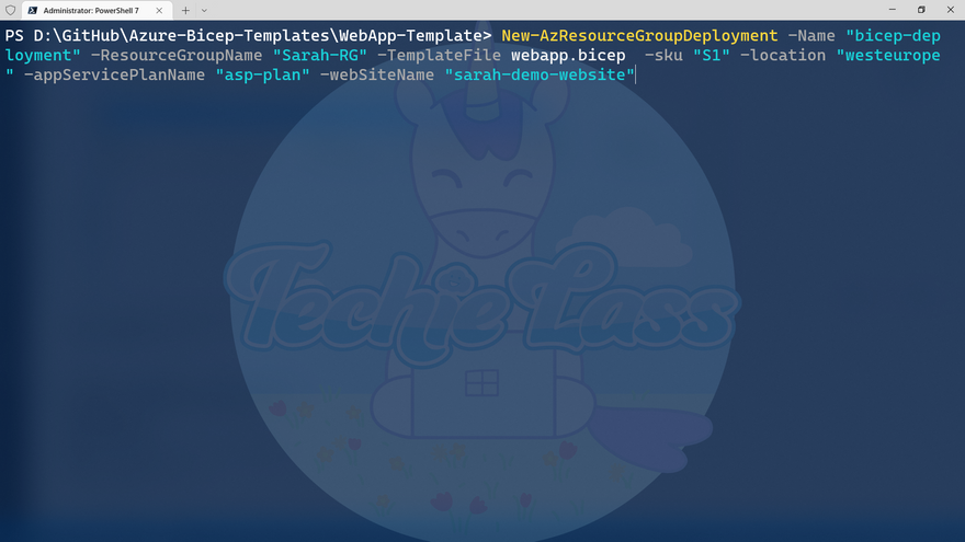 New-AzResourceGroupDeployment -Name "bicep-deployment" -ResourceGroupName "Sarah-RG" -TemplateFile webapp.bicep -sku "S1" -location "westeurope" -appServicePlanName "asp-plan" -webSiteName "sarah-demo-website"