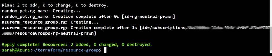 This will initiate the deployment, the -auto-approve command will avoid us having to type in yes to proceed with the deployment. If you don’t append the -auto-approve command then you would have to type in “yes” to deploy the resource.