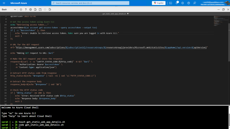 This Bash script provides a simple and effective way to retrieve all the API fields from your Azure Static Web App. By leveraging the Azure CLI and curl, you can automate the retrieval of detailed configuration information, which can be helpful for monitoring, troubleshooting, or documenting your web app's setup.