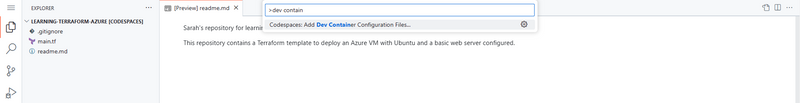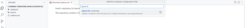 We are going to be working with Azure and Terraform so we are going to start our dev container build using a community template called Azure CLI