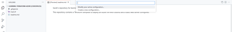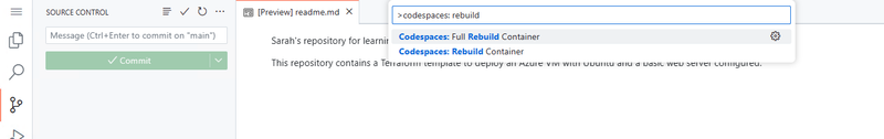 It may take a few minutes for your container rebuild to happen. Once it has been rebuilt you will have a development environment that has the Azure CLI, Terraform and Azure Export for Terraform tool installed.