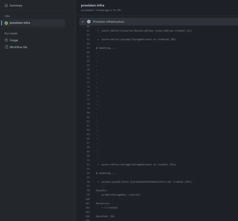 This workflow first authenticates to Azure using OIDC with the azure/login action and then performs some Azure CLI commands to interact with Azure resources. That's fine and probably enough to get you started but you surely want to provision your infrastructure using a more declarative solution than an Azure CLI script. So let's see a more interesting pipeline still authenticating via Azure OIDC but using Pulumi to provision the Azure resources.