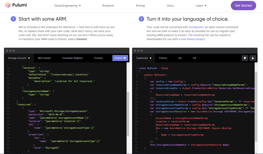 If you have already spent time building a complex infrastructure with another IaC tool and want to migrate to Pulumi while preserving the organization of your code and without rewriting everything with Pulumi SDKs from scratch, Pulumi has some conversion tools to help you with that. For instance, you can use the arm2pulumi converter to convert your ARM templates to Pulumi code written in your preferred programming language. You can try it yourself on the website to see what it looks like.