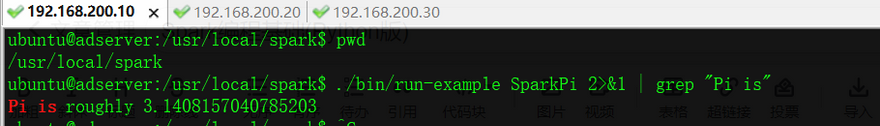 With the above configuration information, spark can store data in Hadoop distributed file system HDFS or read data from HDFS. If the above information is not configured, spark can only read and write local data, but cannot read and write HDFS data. After configuration, it can be used directly without running the startup command like Hadoop. Verify whether spark is successfully installed by running the example provided by spark.