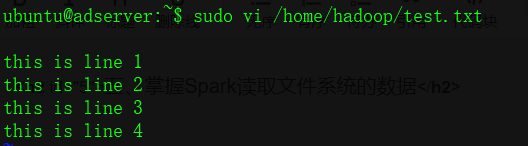 >>> lines = sc.textFile("file:/home/hadoop/test.txt")