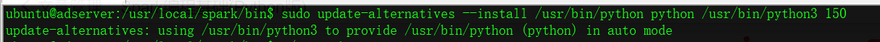 ubuntu@adserver:/usr/local/spark/bin$ sudo update-alternatives --install /usr/bin/python python /usr/bin/python3 150